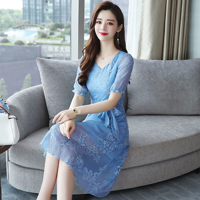 时尚刺绣雪纺连衣裙蕾丝边中长款
